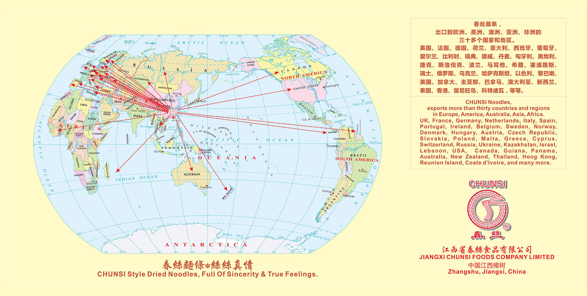 江西省春絲食品有限公司位于江西省樟樹市。 樟樹具有制作面條的悠久歷史傳統。古來即有民謠:“臨江府、清江縣(即樟樹),六歲伢仔會做面?!?今春絲公司是江西省內具有規模的面條、米粉加工企業,也是全國知名的面條生產企業。春絲公司現擁有“春絲”、“凌波仙子”、“絲絲?!?、“春佳”四大品牌,一百多個品種。所有面條、米粉產品均選用合格原料,符合國家質量和衛生標準。產品具有安全健康、面體勁道、柔韌爽滑、易熟、久煮不糊、不渾湯等特色,深受廣大消費者歡迎。春絲產品已全面進入沃爾瑪、家樂福、樂購、歐尚、好又多、易初蓮花等大型超市,并遠銷美國、日本、英國、德國、法國、西班牙、意大利、葡萄牙、香港等二十多個國家和地區。